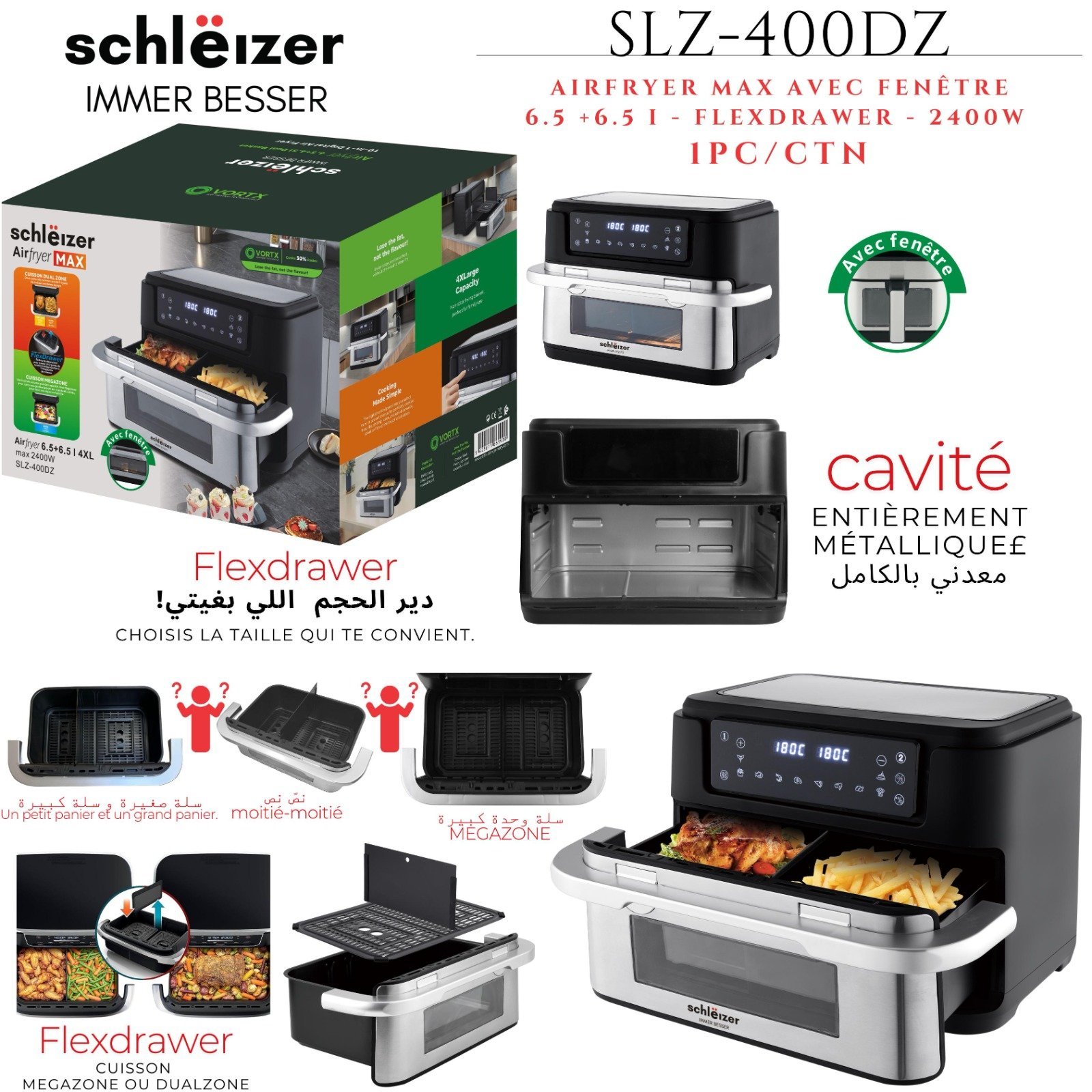 استمتع بتحضير وجبات لذيذة بسرعة وسهولة مع قلاية شلايزر الهوائية، المصنوعة من المعدن بالكامل من الداخل. تتميز بقدرتها على التكيف مع احتياجاتك، حيث يمكنك تخصيص حجم السلة الداخلية حسب اختيارك: